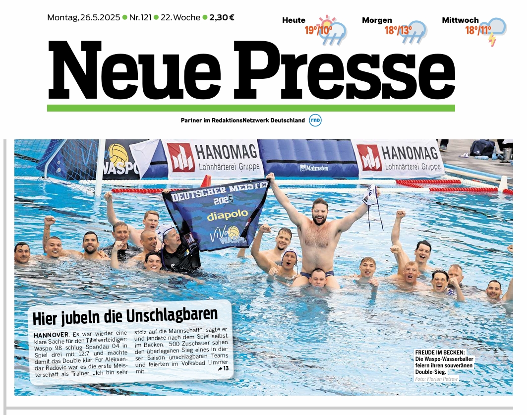 Es hätte gerne größer ausfallen können, doch auch zum Meisterschaftsfinale 2025 gab es zumindest ein kleines Rauschen im Blätterwald. Während eine der beiden hannoverschen Regionalzeitungen sogar die Titelseite nutzte, blieb das Interesse in Medien- und Millionenmetropole Berlin diesmal extrem dürftig. Auch ein TV-Bericht wurde anders als beim Pokalfinale diesmal vermisst, doch berichteten zumindest die beiden großen internationalen Wasserball-Portale von den Finalspielen. Nachfolgend finden Sie eine Übersicht von Beiträgen, die ganz oder zumindest teilweise auch online verfügbar waren (ohne Anspruch auf Vollständigkeit ...):